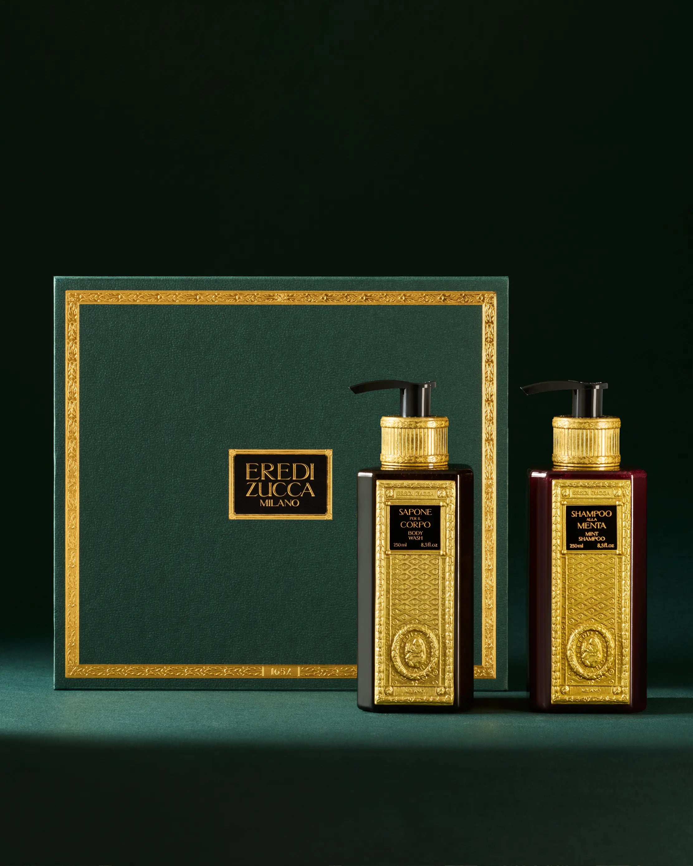 An essential ritual that revitalises both skin and hair. A body wash and mint shampoo co-exist within a gift set dedicated to daily purification, presented in a box embellished with the signature codes of Eredi Zucca’s aesthetic universe.