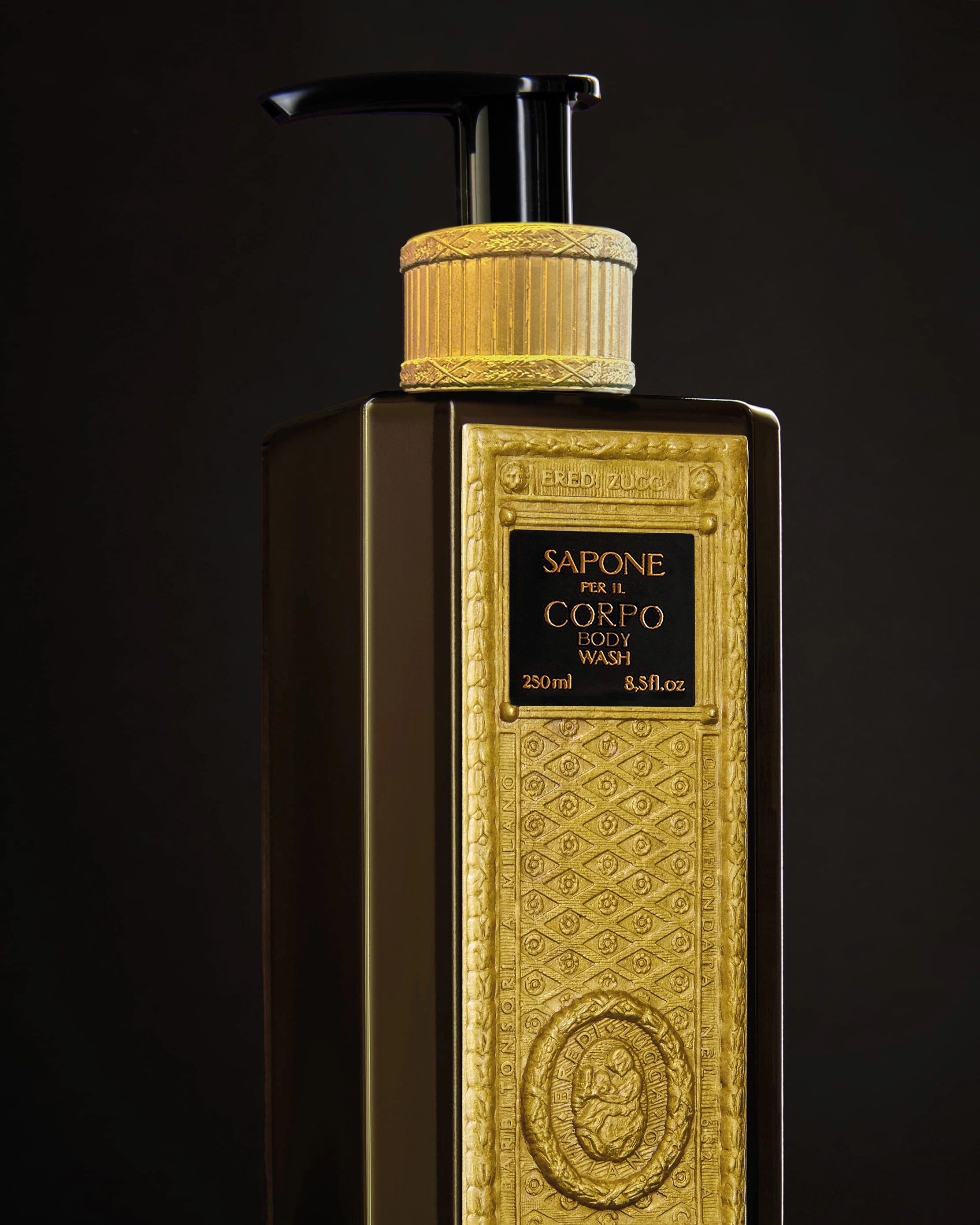 - Contained in a 250 ml brown PETG bottle, embellished with brass Eredi Zucca details