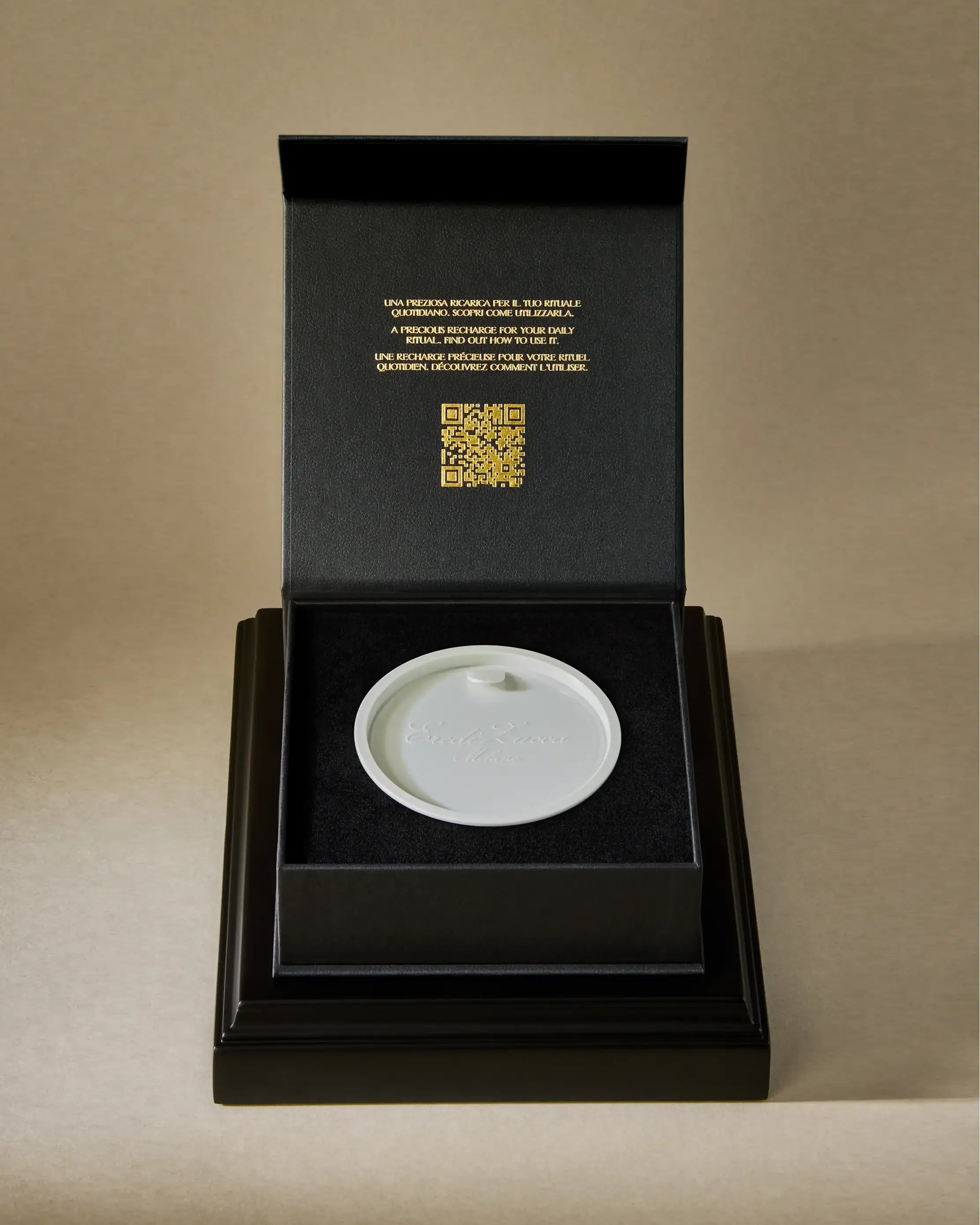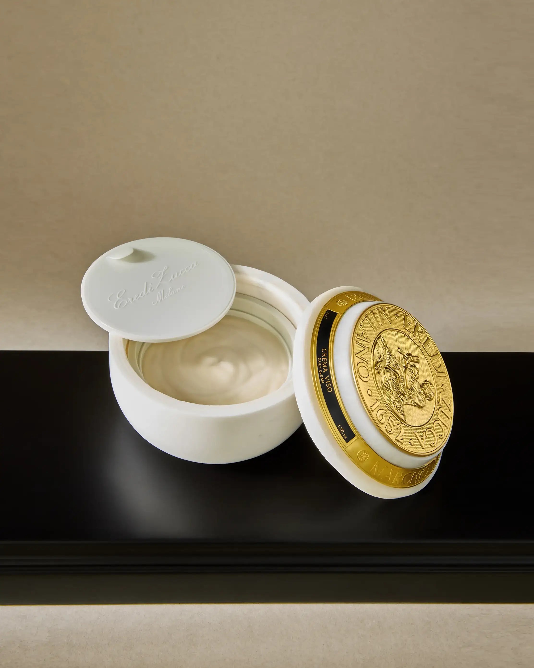 - Contained in a 50 ml jar crafted from Eredi Zucca’s iconic white marble, embellished with a brass medallion with Eredi Zucca logo