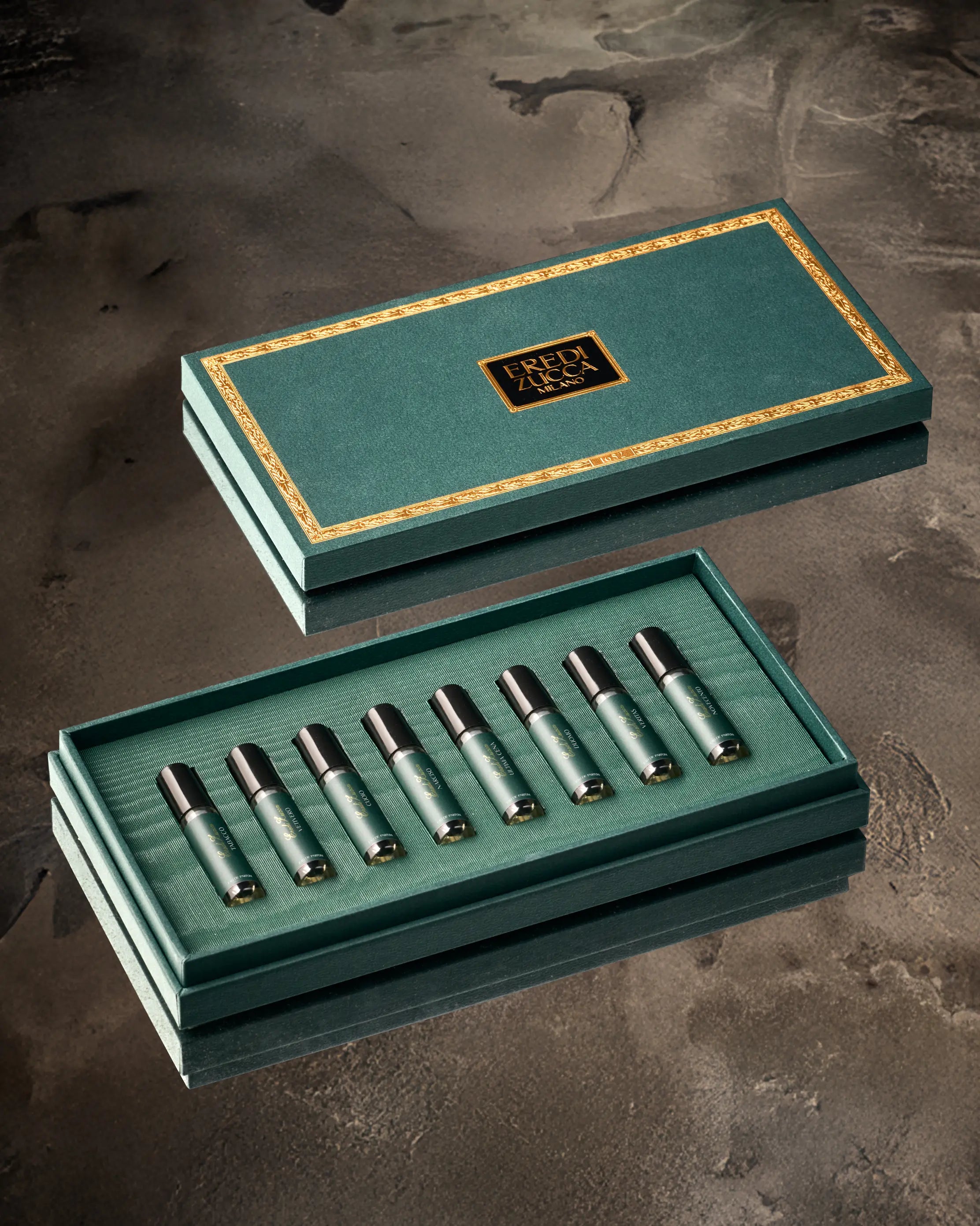 The Eredi Zucca Discovery Set presents eight signature fragrances in 3 ml vials, each a tribute to Milan’s cultural legacy and the artistry of perfumery. From the earthy purity of vetiver through the sacred depth of myrrh to the irresistible softness of iris, the set offers an evocative journey through our iconic olfactory creations – an odyssey of craft, imagination and symbolism. Perfect for personal exploration or as a refined gift, it invites you to experience the Eredi Zucca Fragrance Collection in its full radiance.