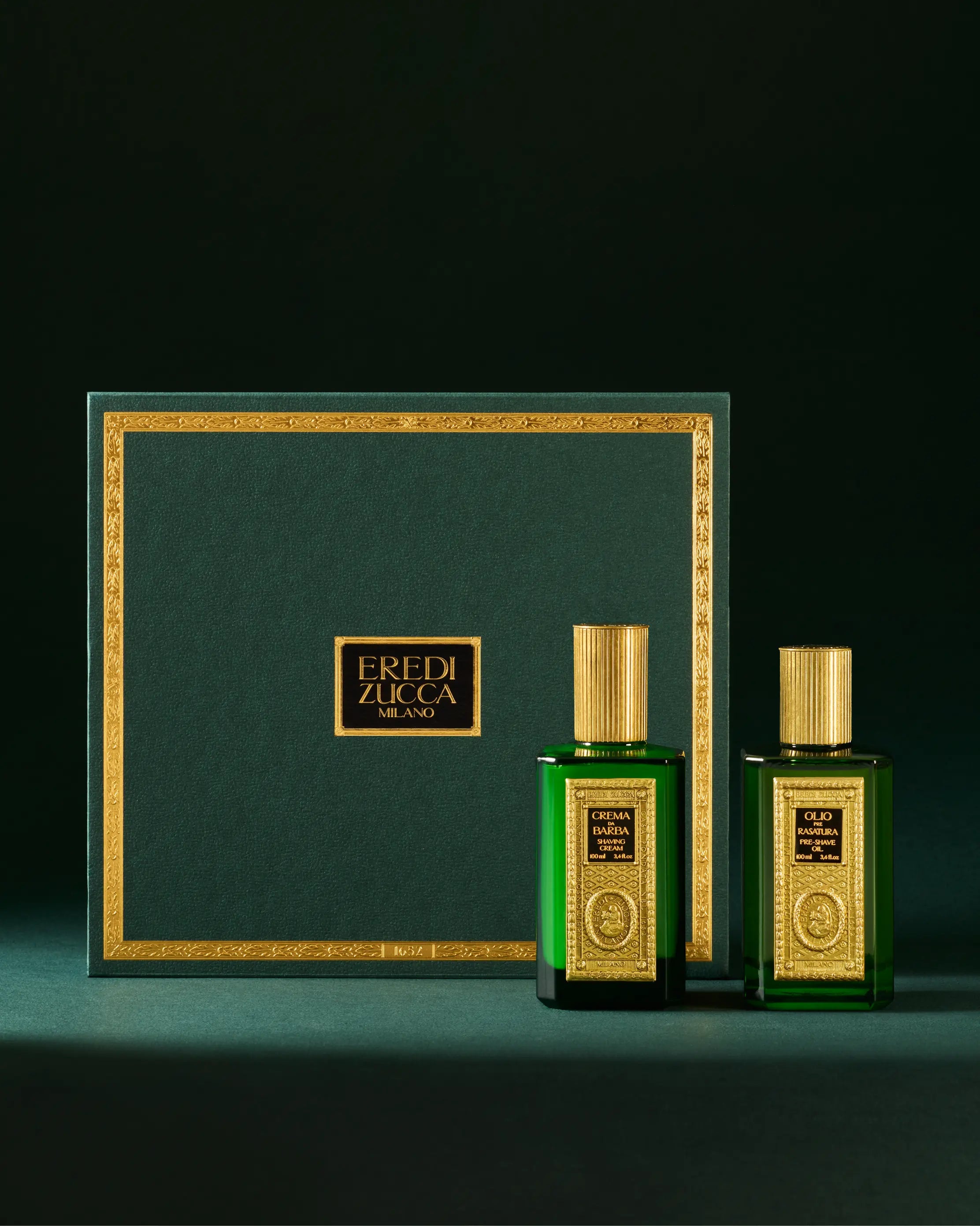Because a flawless shave lies in the preparation, this set brings together two formulas that work in perfect harmony: a pre-shave oil and shaving cream. The box in which they are presented perfectly embodies the stylistic DNA of Eredi Zucca, opening to reveal two deep green glass bottles embellished with brass details in a balanced dialogue between artisanal tradition and modern sensitivity.