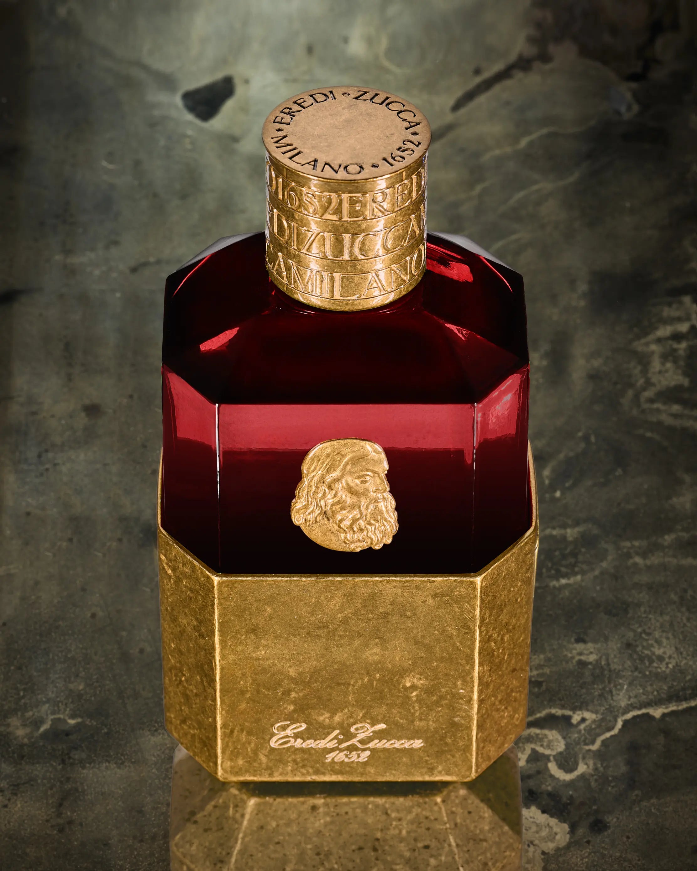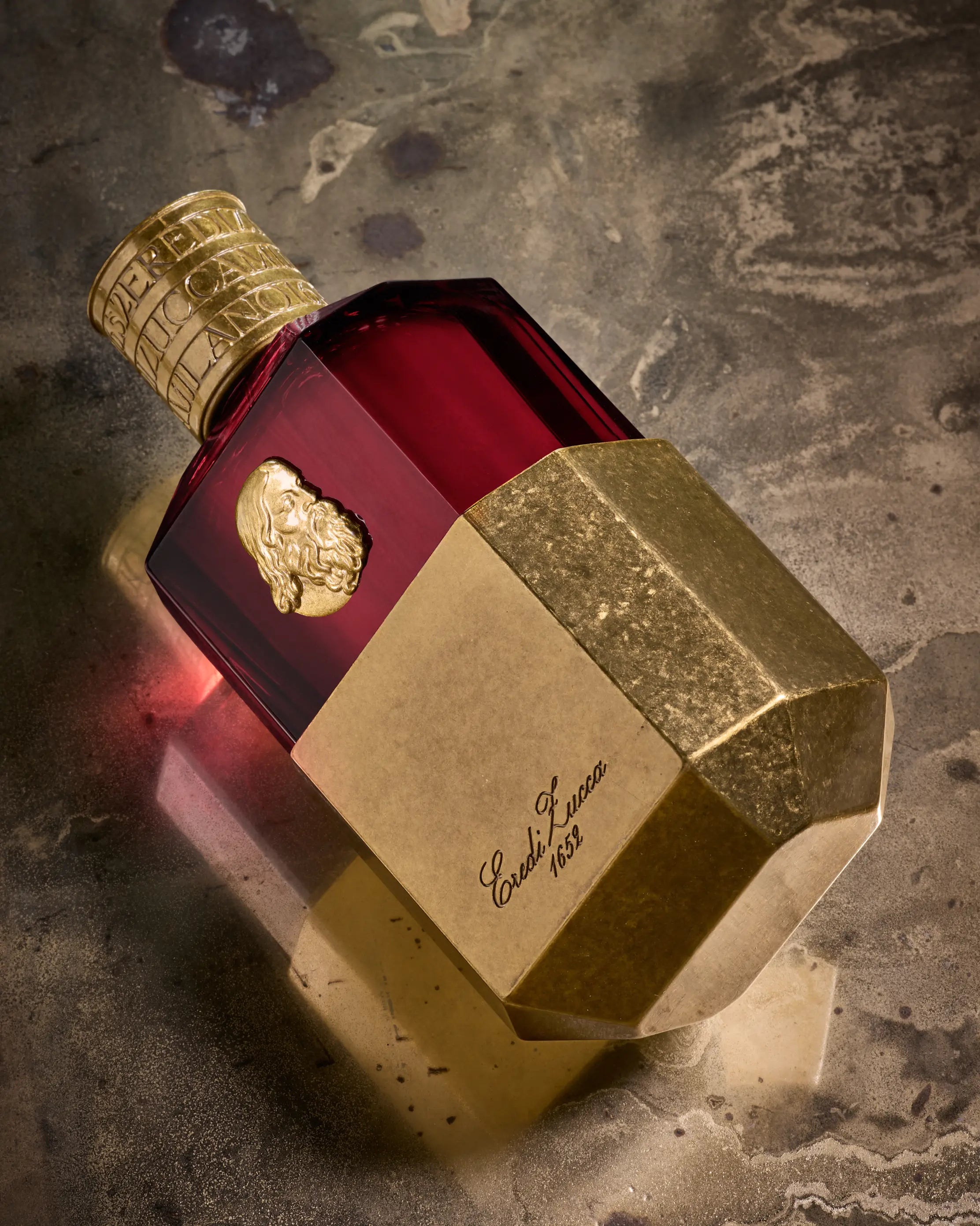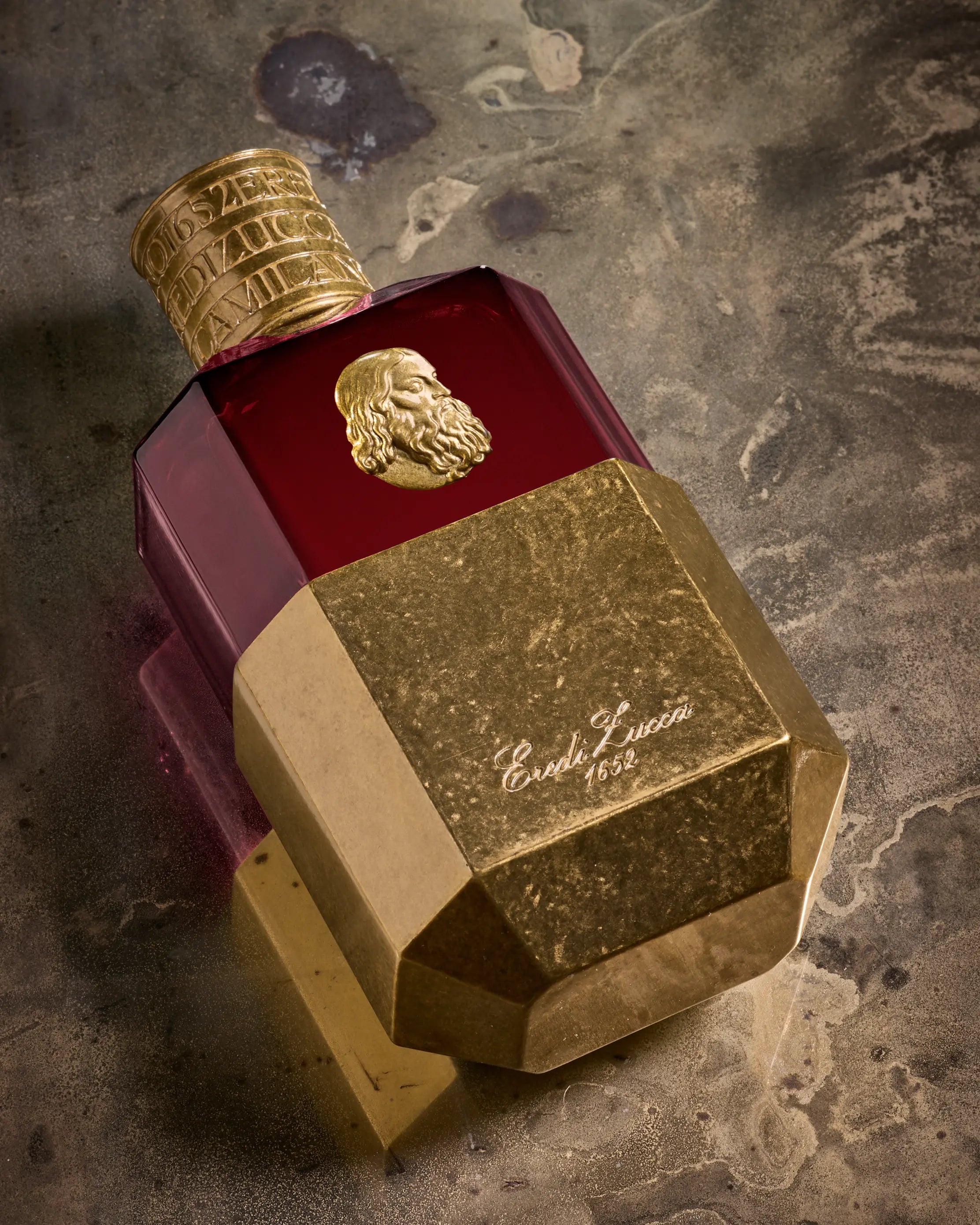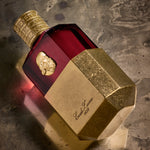 - Housed in a 100 ml diamond-faceted glass flacon recalling antique crystal perfume bottles, encased in brass-finished metal and crowned with a finely engraved cap