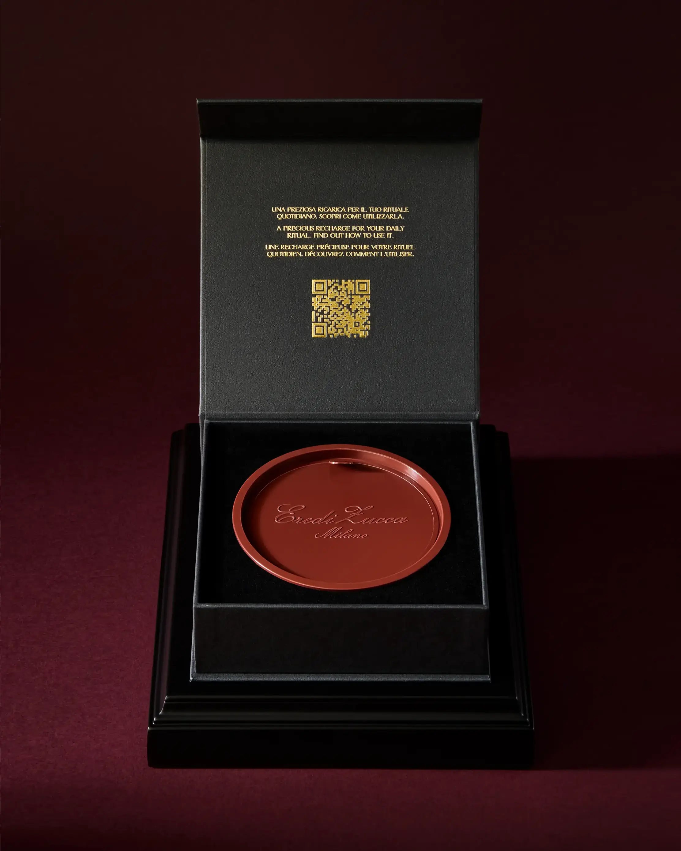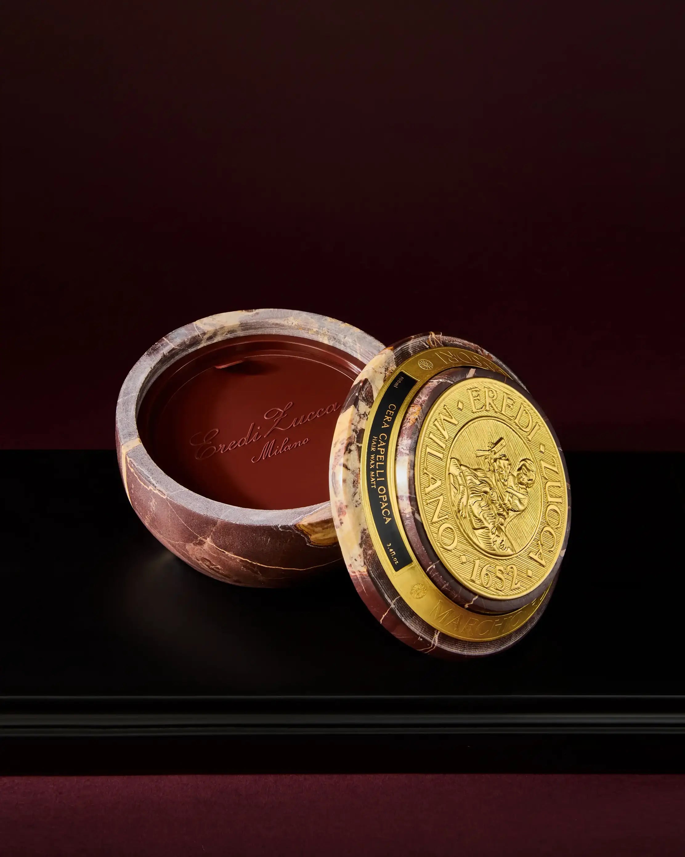 - Contained in a 100 ml jar crafted from Eredi Zucca’s iconic burgundy marble, embellished with a brass medallion with Eredi Zucca logo
