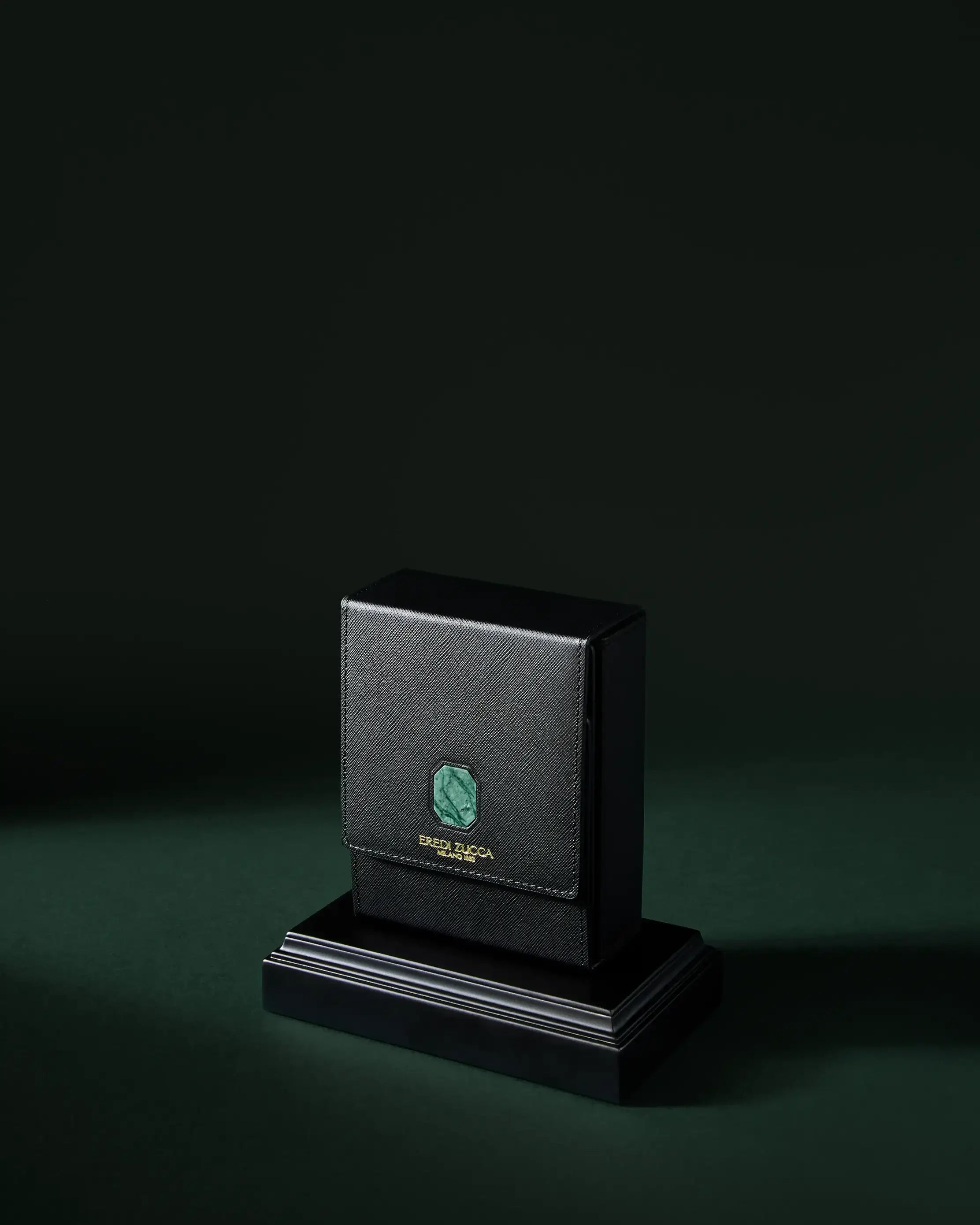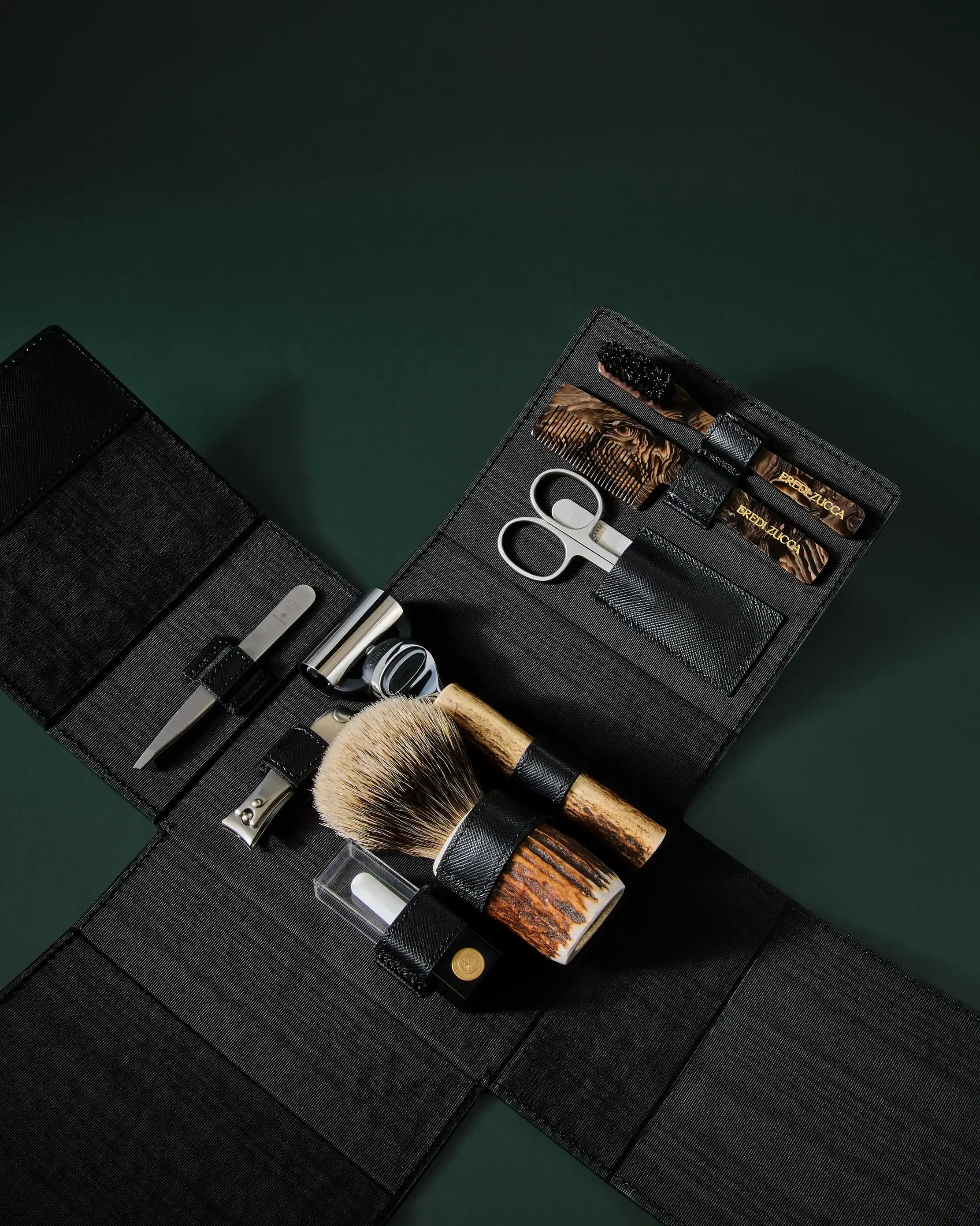 Dédié à l'homme du monde attaché à la beauté et à la fonction, cet étui de voyage est fabriqué à la main en Italie en cuir Saffiano fin. Il contient une sélection de nos essentiels de grooming les plus prisés : un peigne à barbe et une brosse à moustache, un rasoir Fusion en bois de cerf, un blaireau de rasage à poils argentés et un kit de manucure complet. Le charme raffiné de notre marbre vert signature et le logo doré Eredi Zucca imprimé à chaud viennent parfaire cet étui.