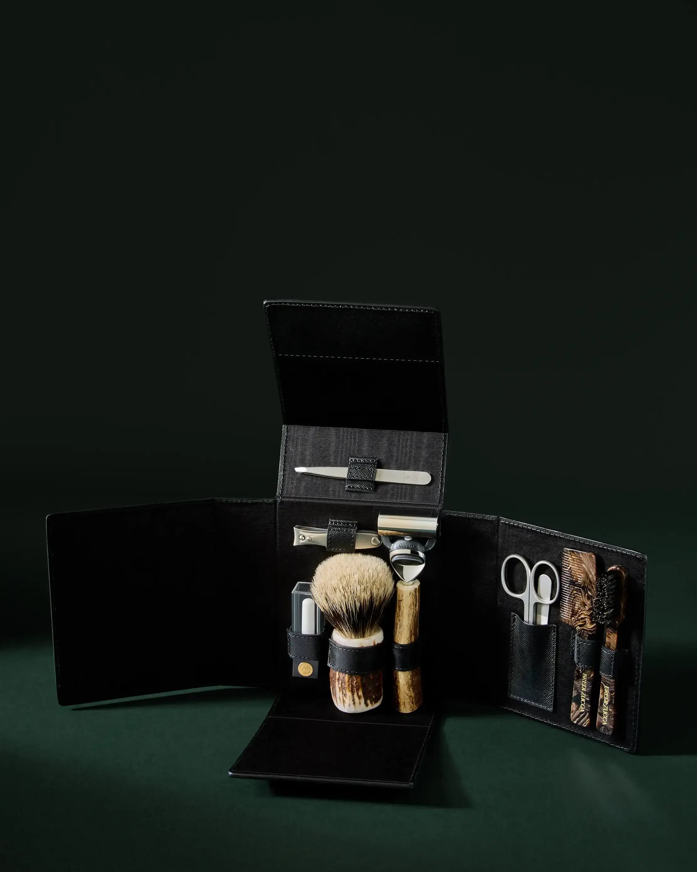 - Contient : 1 peigne à barbe, 1 brosse à moustache, 1 rasoir Fusion en bois de cerf, 1 blaireau en bois de cerf, 1 bâton après-rasage, 1 coupe-ongles, 1 pince à épiler, 1 lime à ongles, 1 ciseaux à ongles