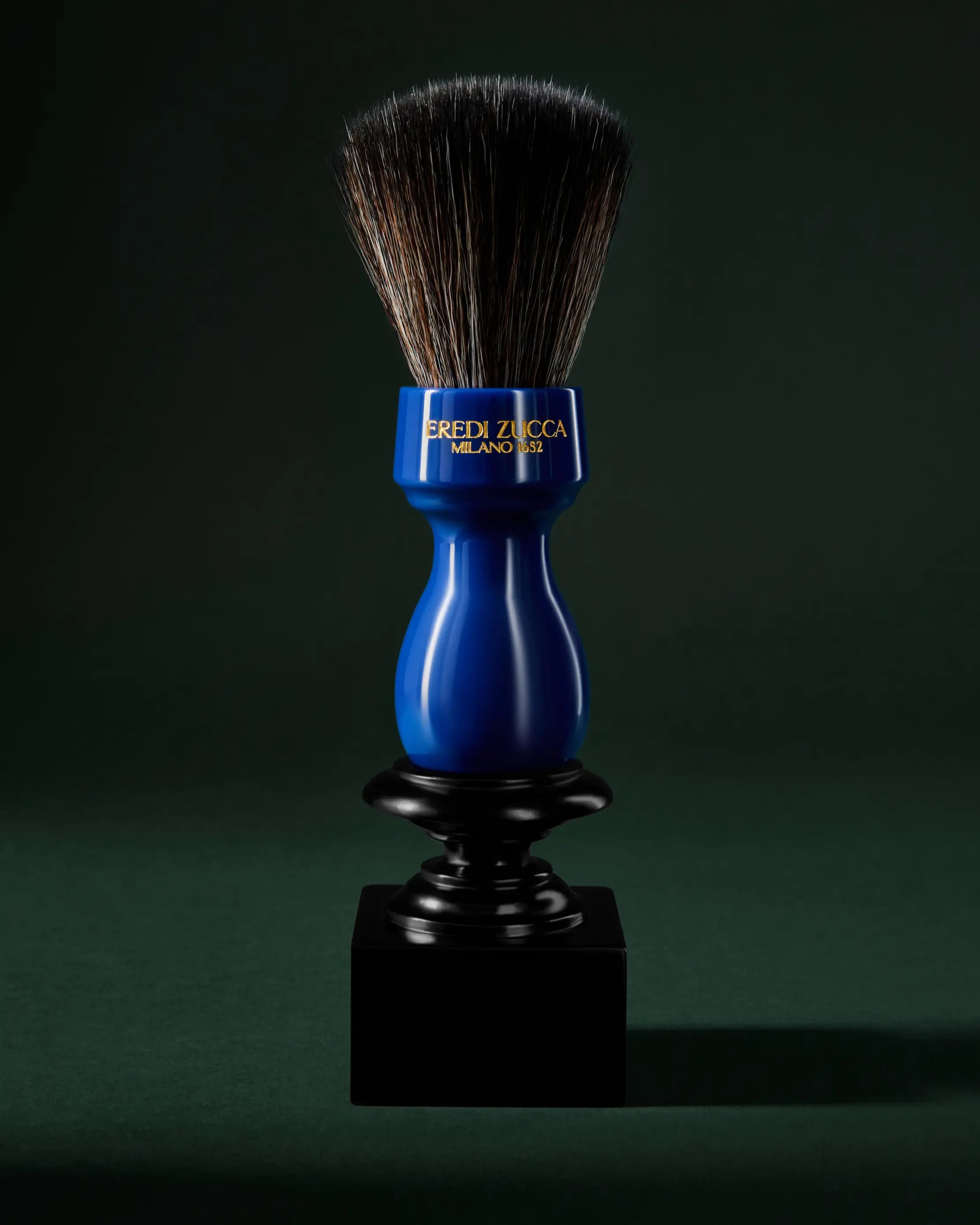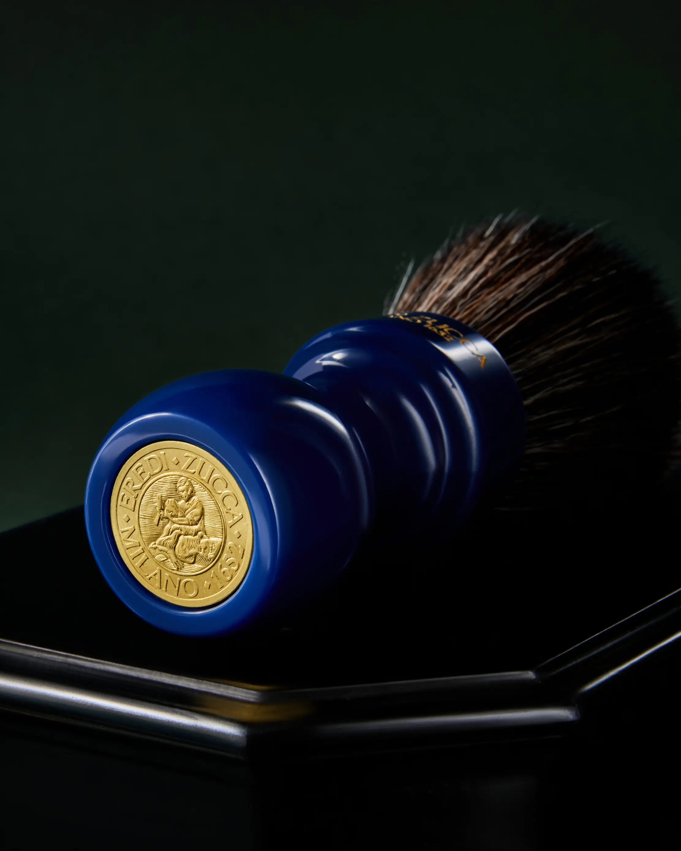 Cet accessoire brille par ses matériaux et détails, tous façonnés selon les techniques du savoir-faire artisanal italien. Son manche en résine révèle des lignes harmonieuses. Entièrement peint à la main en bleu brillant, il est décoré avec le médaillon en laiton Eredi Zucca sur la base. Sa poignée confortable fait de ce blaireau professionnel un accessoire précis, robuste et fonctionnel.