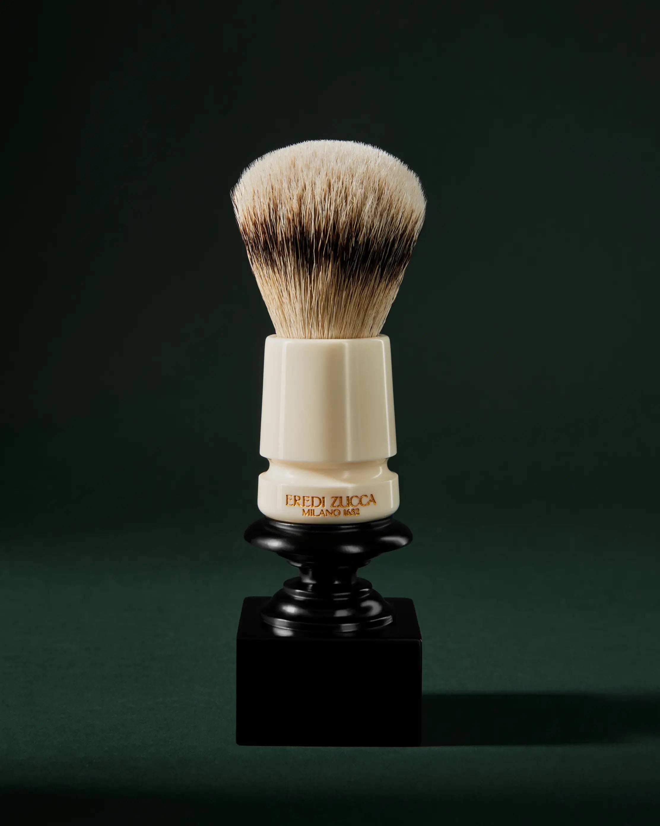 Blaireau de rasage garni de poils de blaireau avec un manche en résine ivoire pour offrir une expérience de rasage supérieure, maîtrisée et performante.