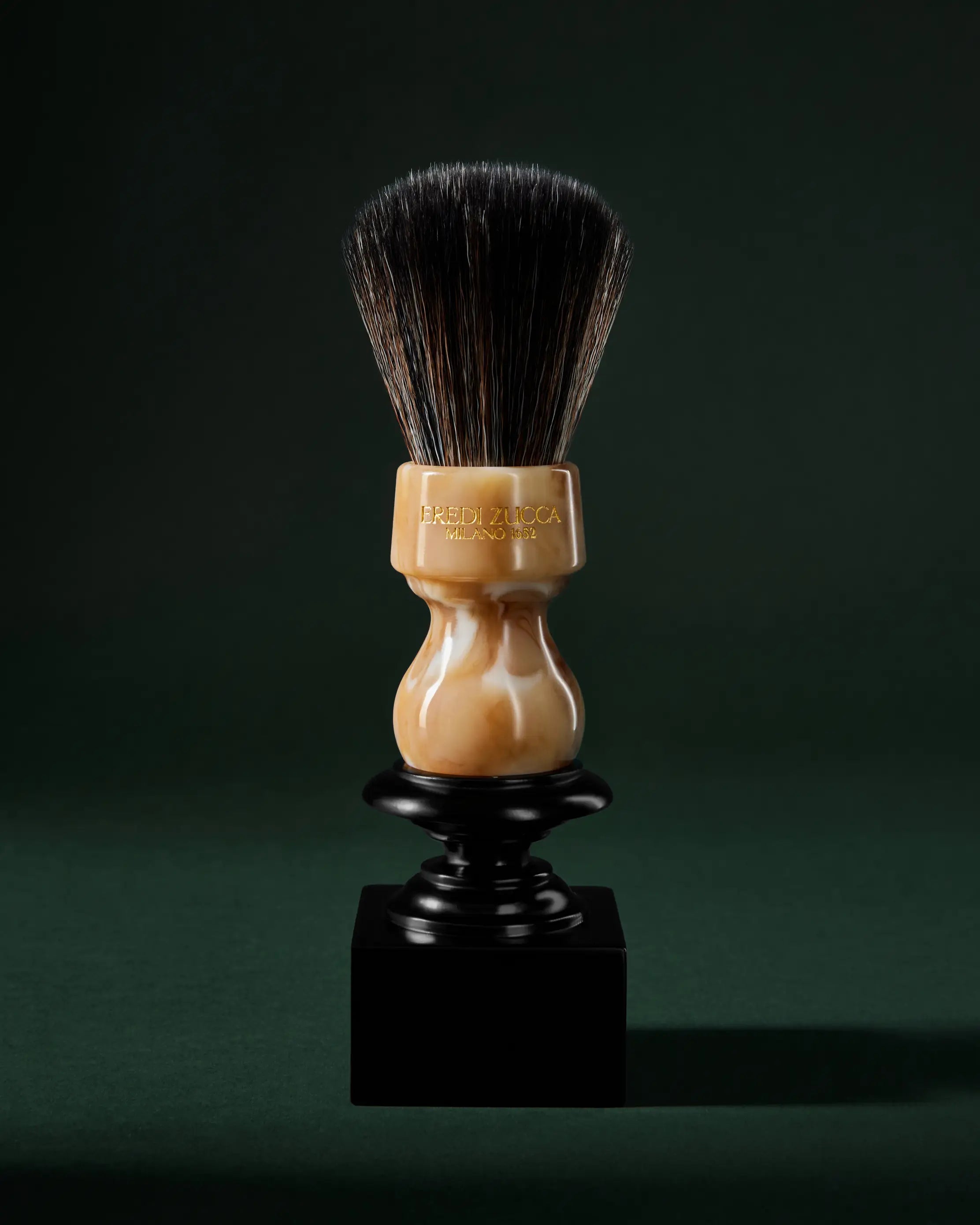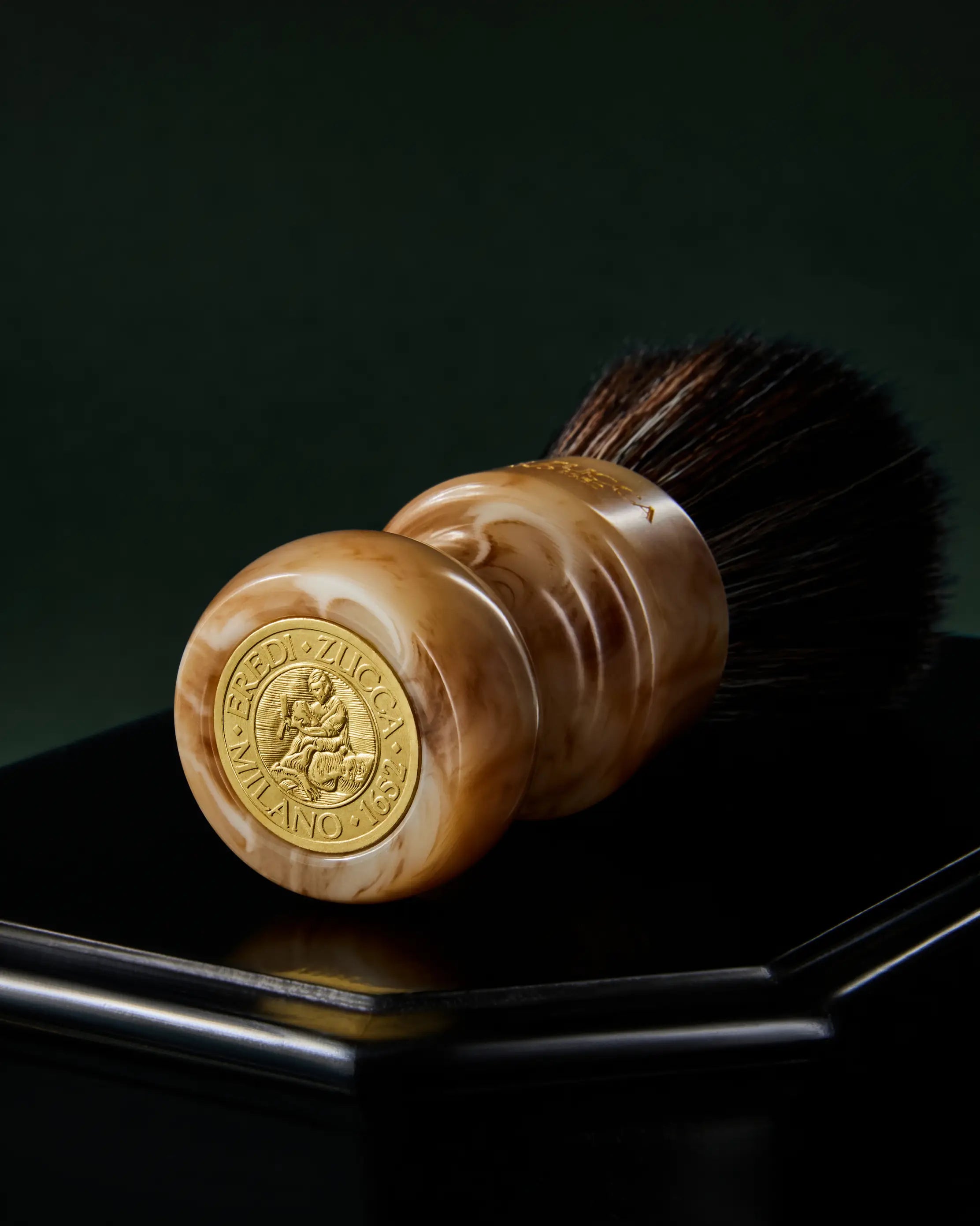 Cet accessoire brille par ses matériaux et détails, tous façonnés selon les techniques du savoir-faire artisanal italien. Arborant une texture sophistiquée effet marbré, le manche en résine révèle des lignes harmonieuses décorées avec le médaillon en laiton Eredi Zucca sur la base. Sa poignée confortable fait de ce blaireau professionnel un accessoire précis, robuste et fonctionnel.