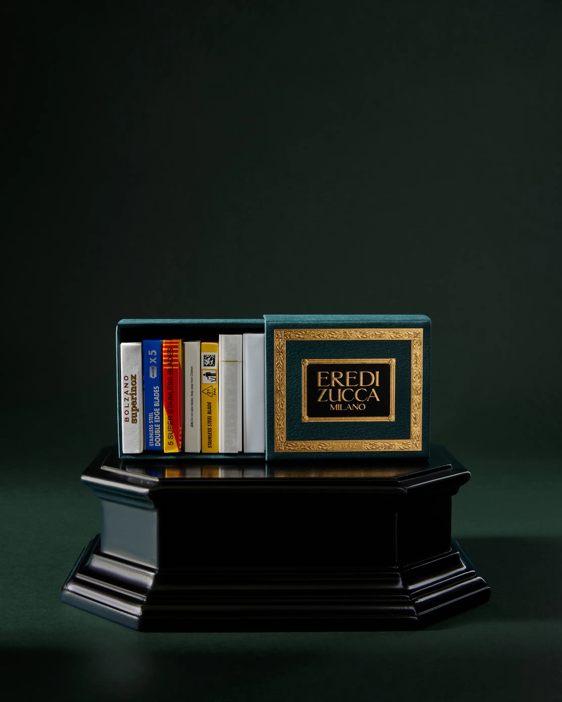 Un étui signé Eredi Zucca renferme les meilleures lames venant de sept pays différents. Pour un rasage fonctionnel et professionnel.