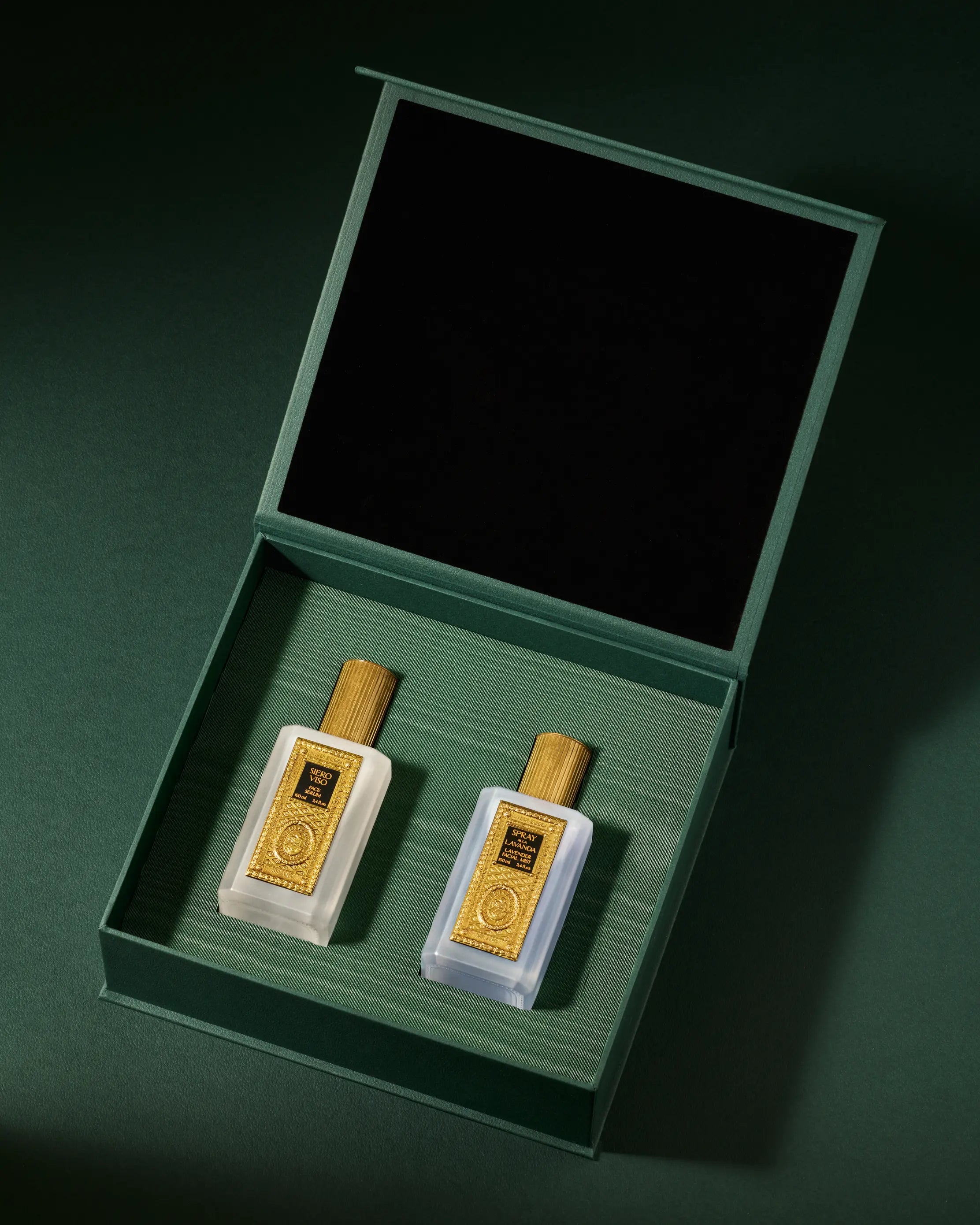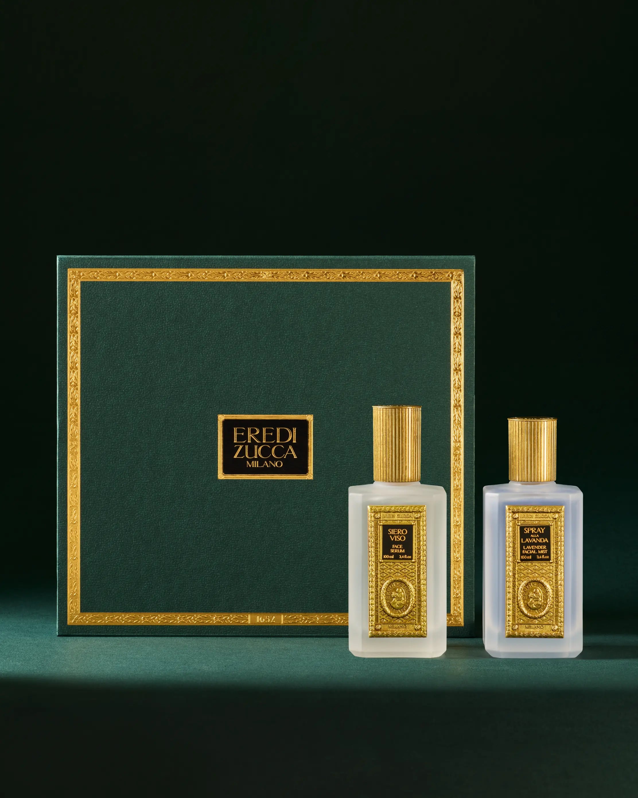 Le sérum visage et le spray à la lavande constituent une routine créée pour protéger, régénérer et revitaliser la peau jour après jour. Le coffret interprète le style caractéristique d’Eredi Zucca et comprend deux flacons en verre transparent ornés de détails en laiton, dialoguant harmonieusement entre tradition artisanale et sensibilité contemporaine.
