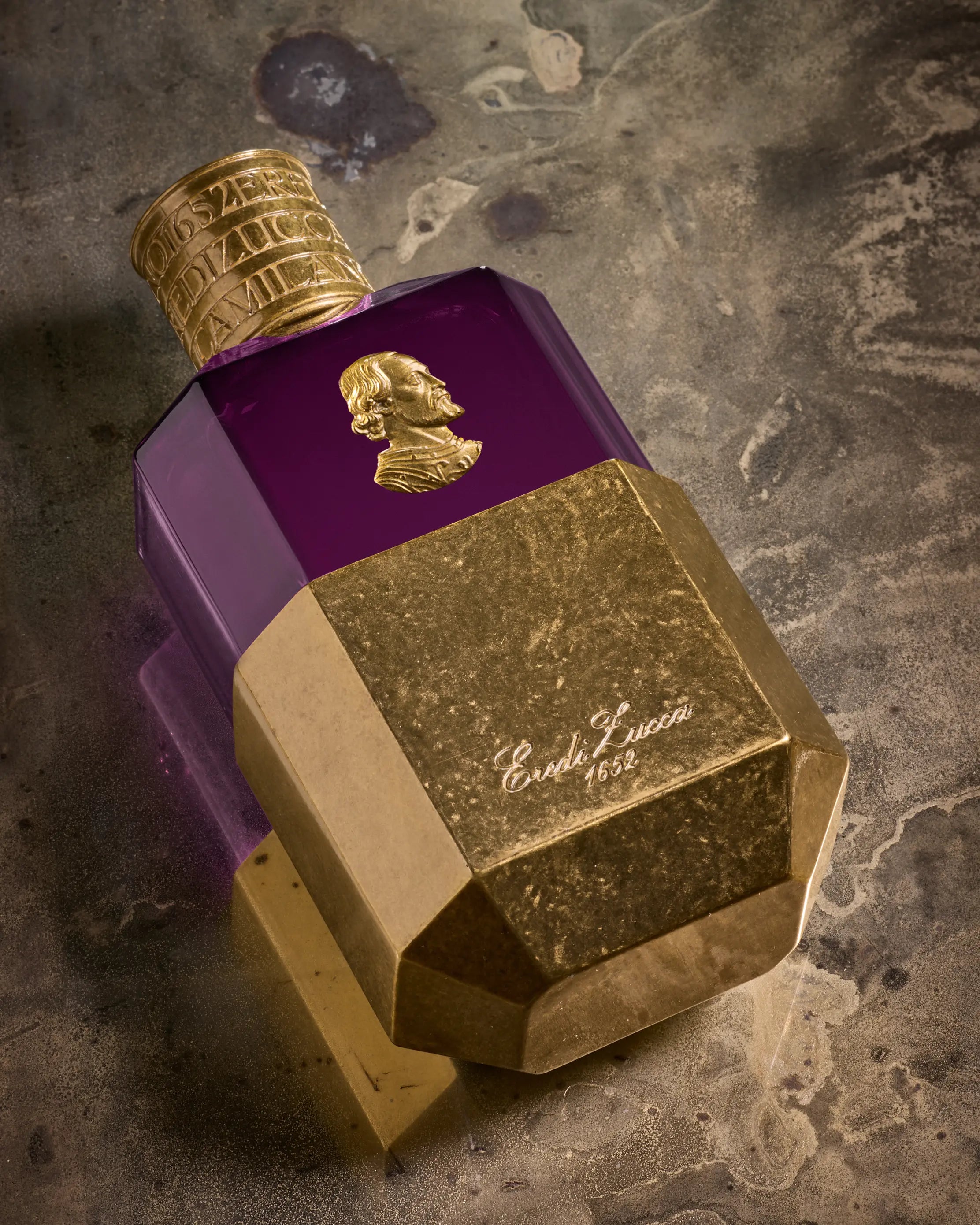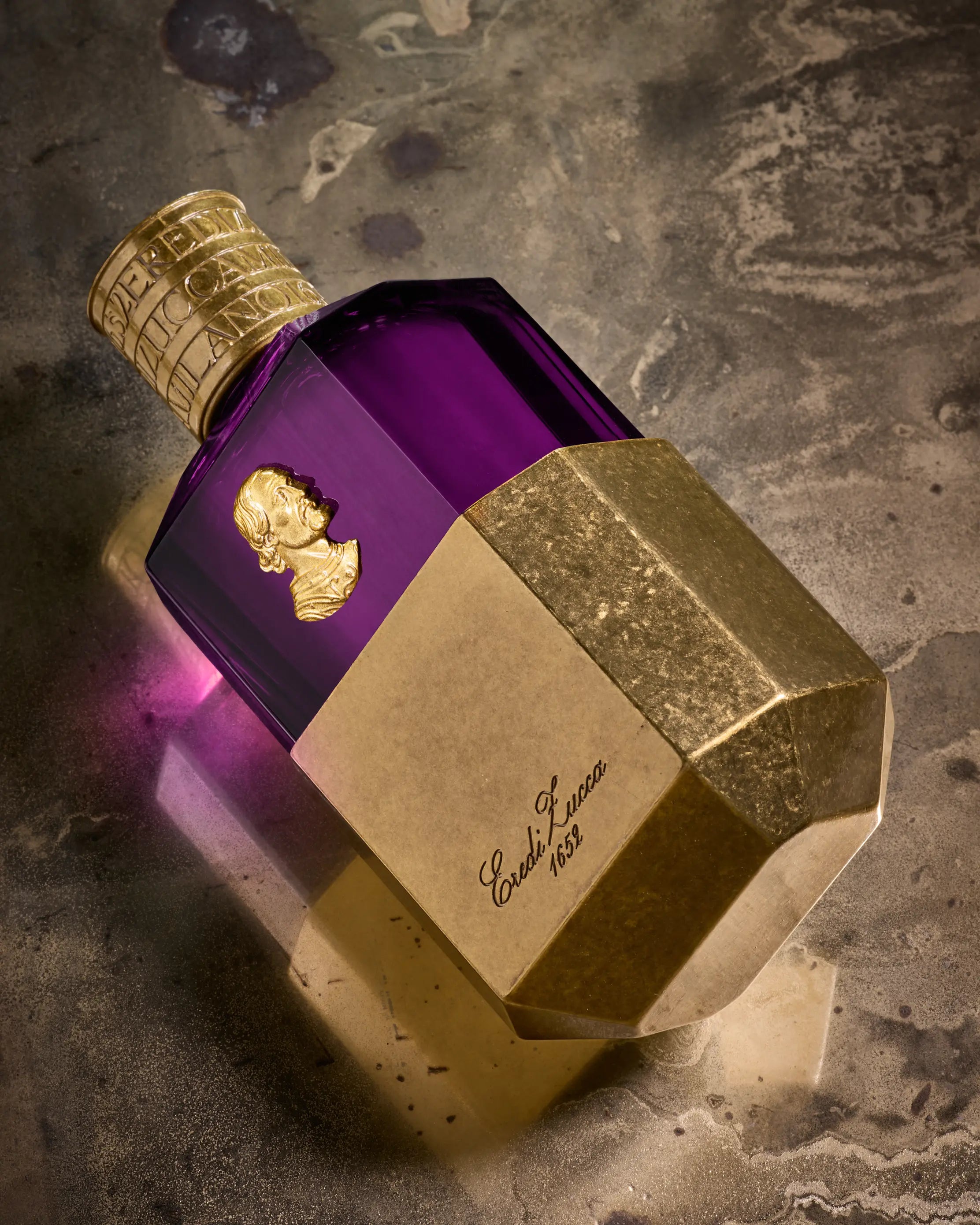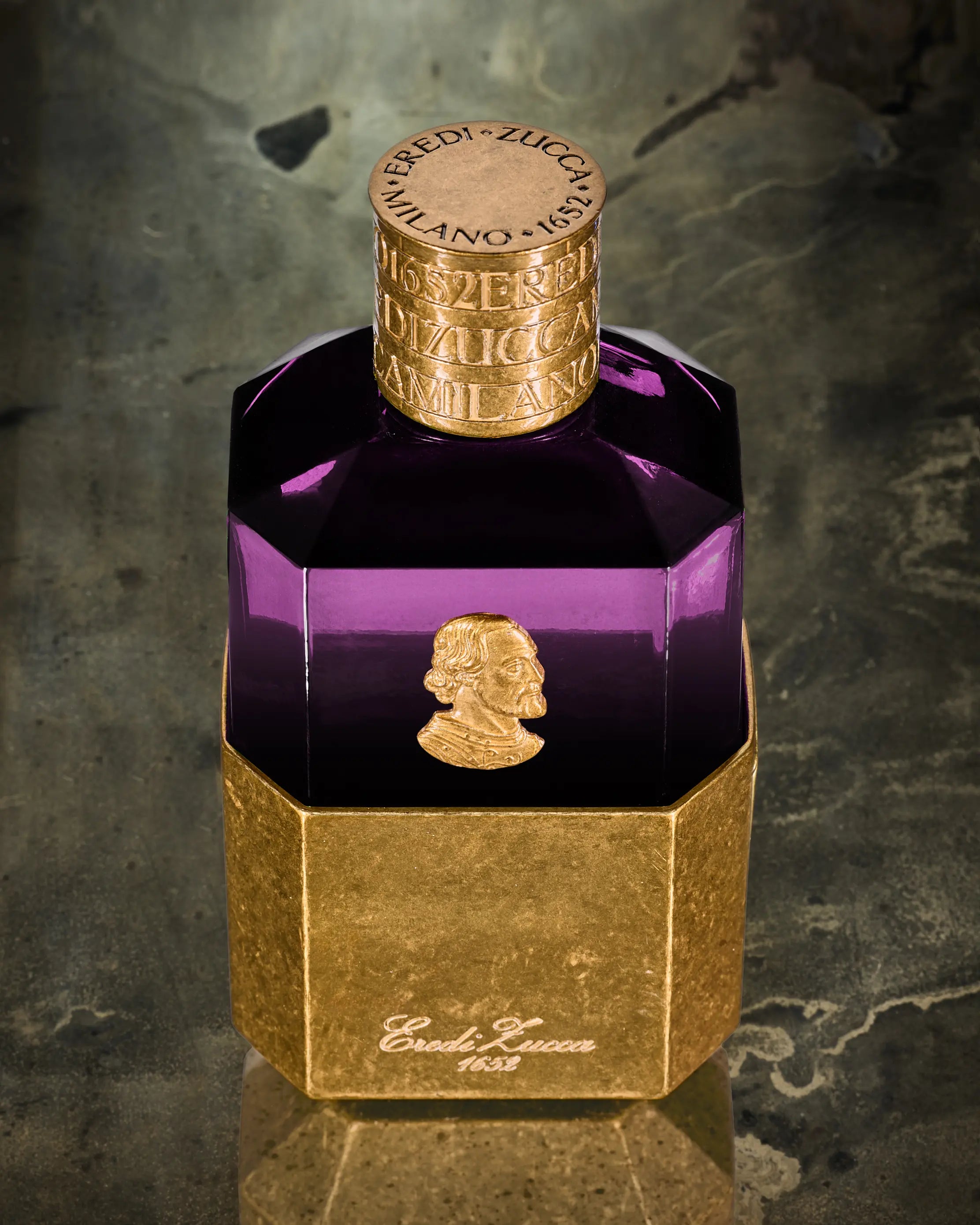 - Il flacone da 100 ml in vetro sfaccettato a diamante ricorda le antiche bottiglie di profumo in cristallo. Completa il design, la base in metallo con finitura ottone e il tappo inciso con il lettering Eredi Zucca