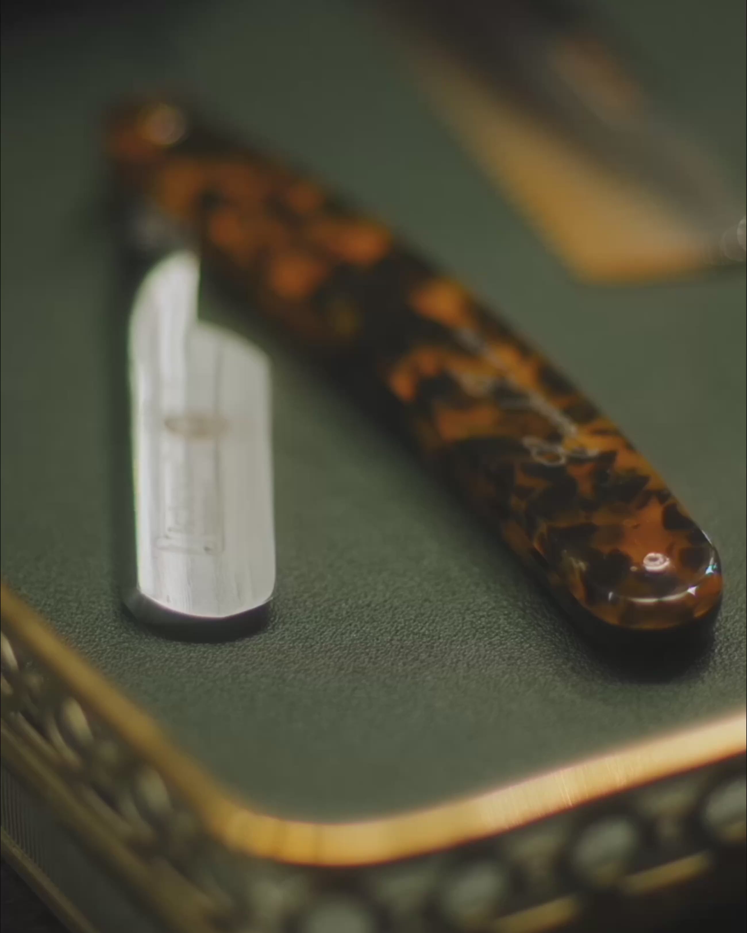 Rasoio a mano libera con lama corta e raffinato motivo "Barbarossa" lavorato a laser. Manico in resina lucida effetto tartarugato.